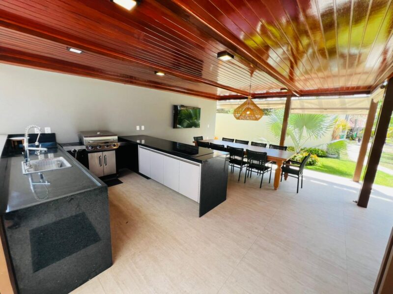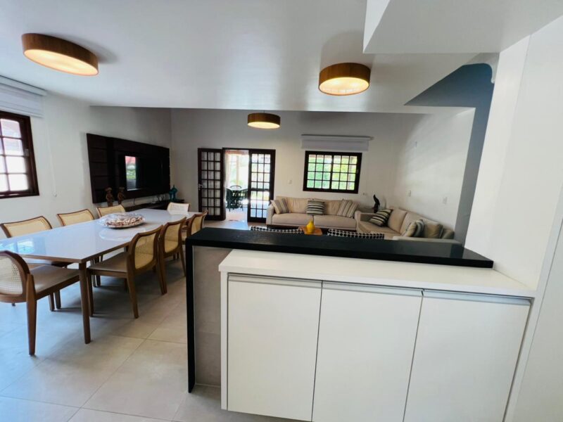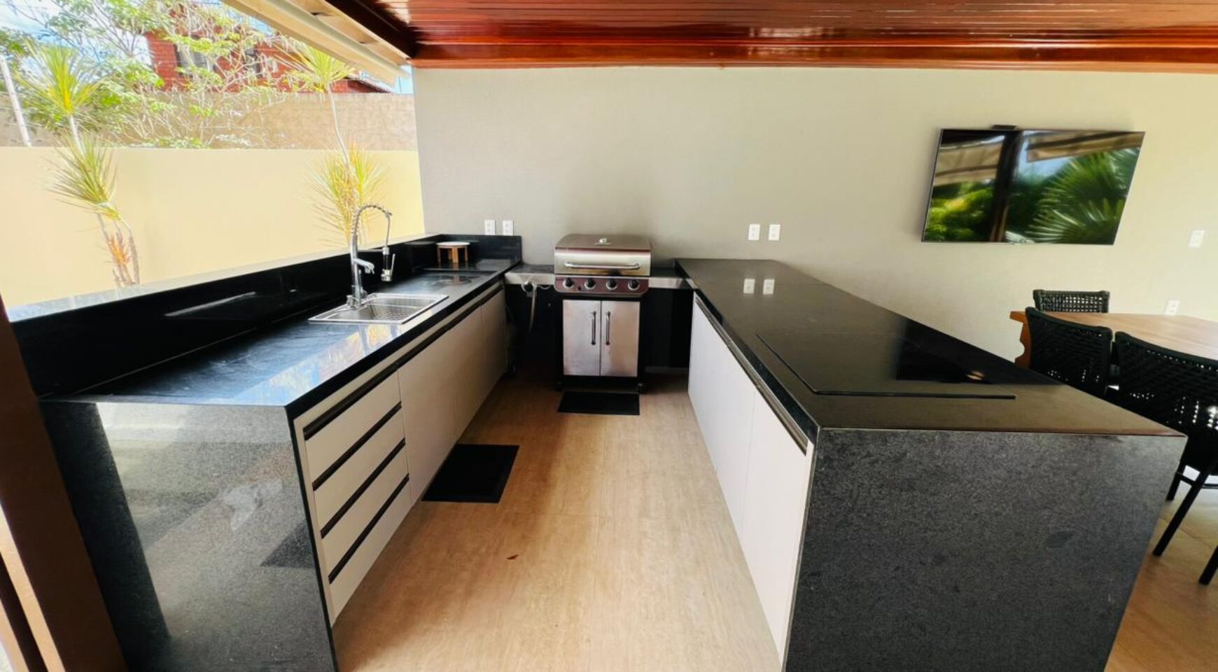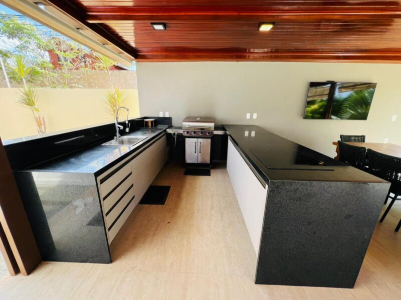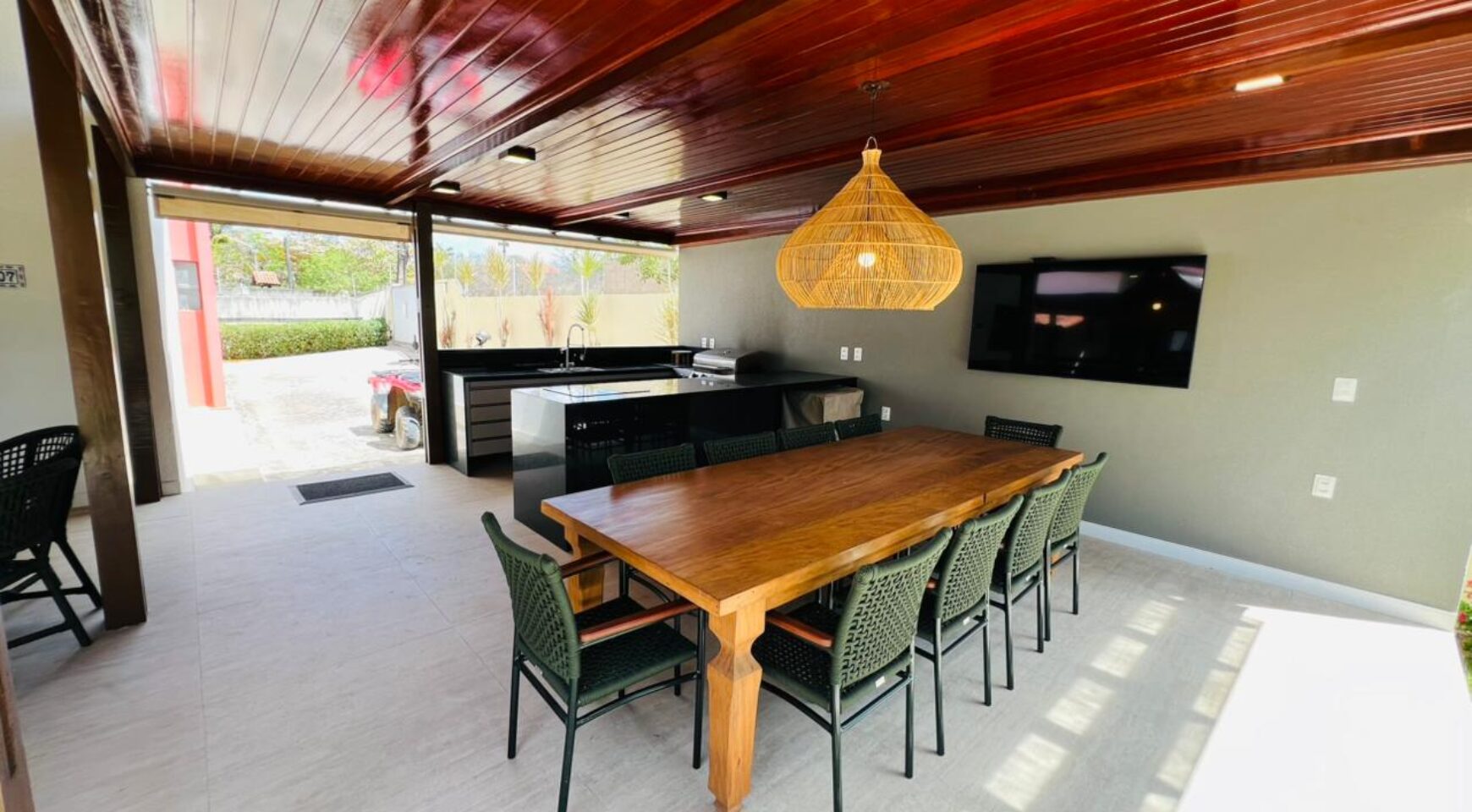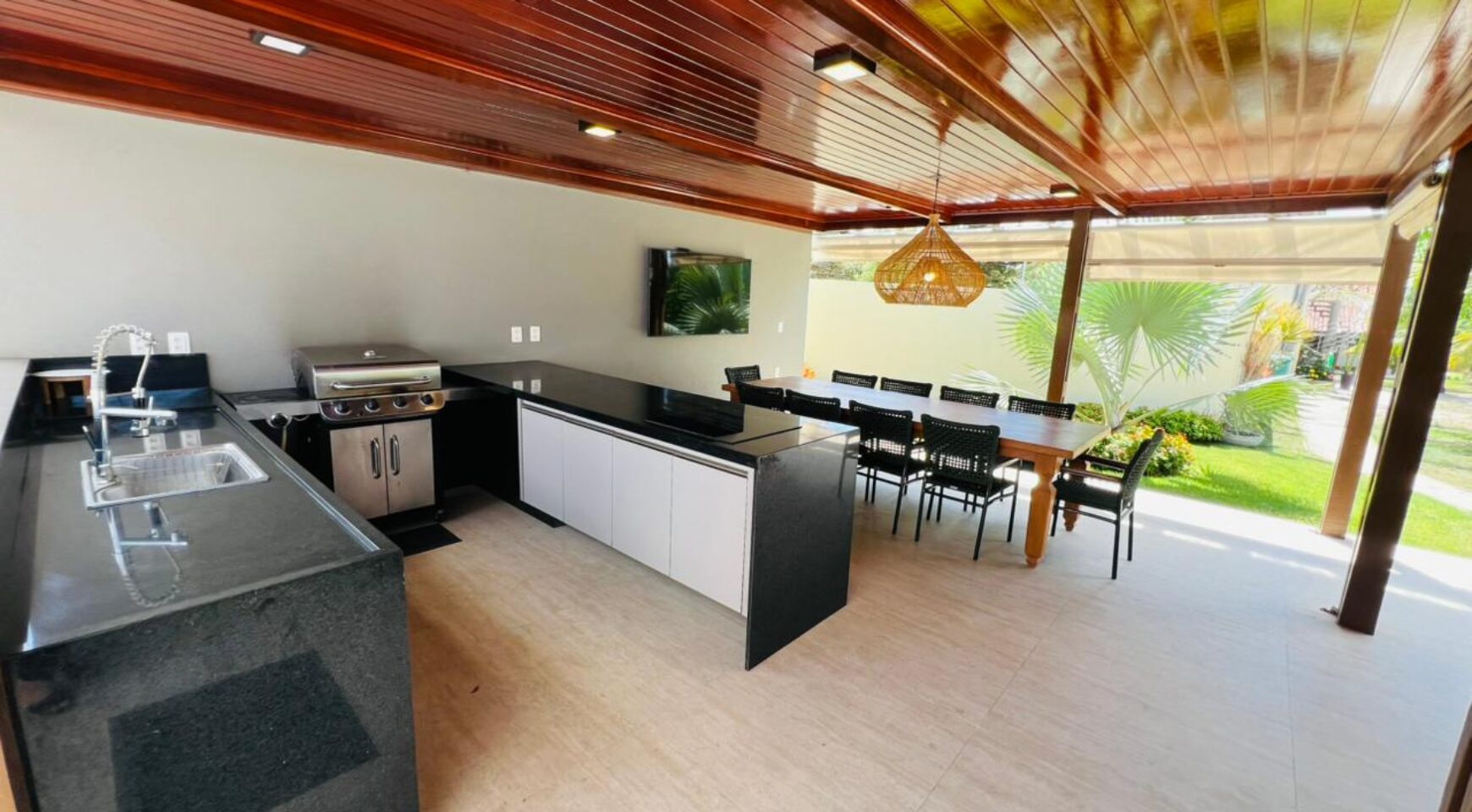 A cozinha é totalmente equipada, planejada para oferecer praticidade no dia a dia, e integrada aos demais ambientes de convivência. A casa possui também área de serviço mobiliada, funcional e bem distribuída.