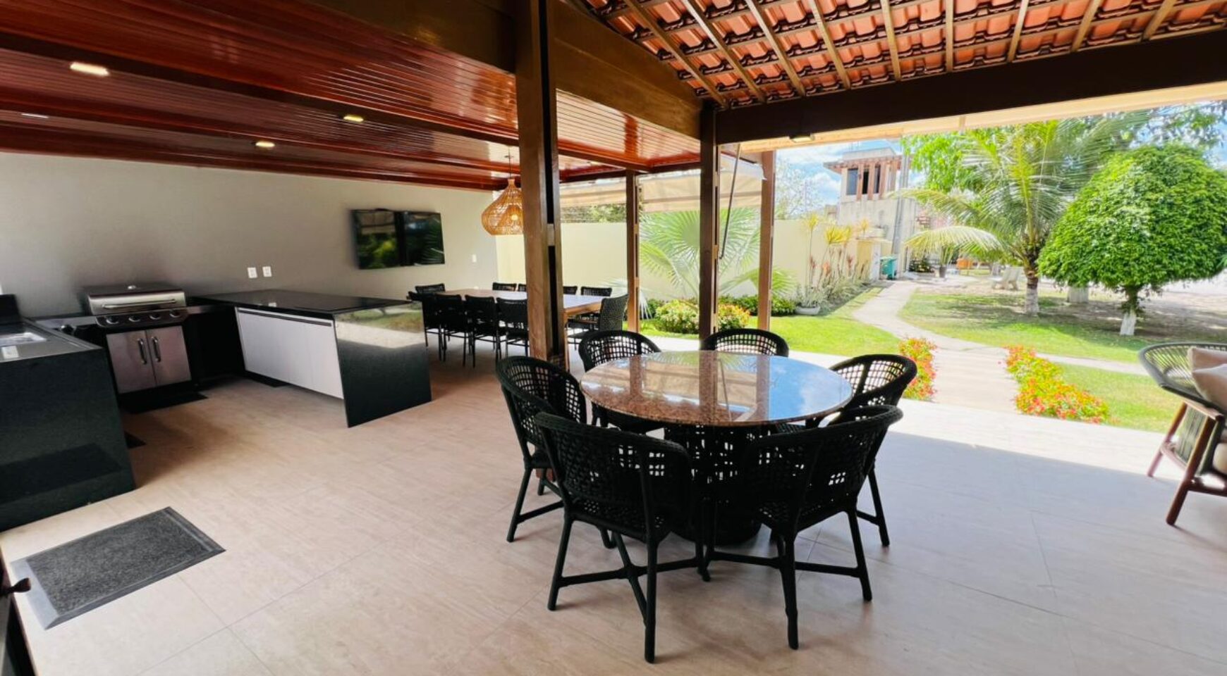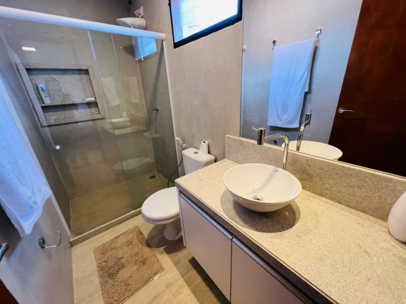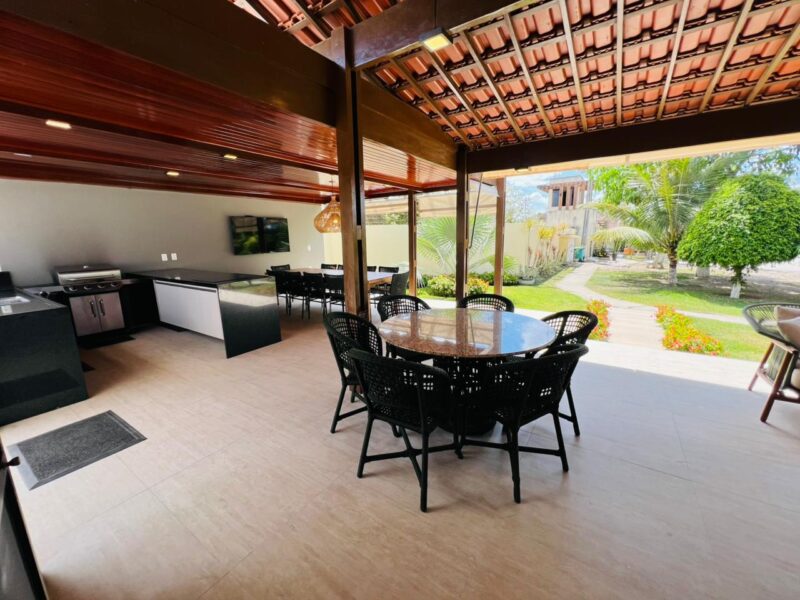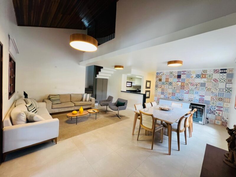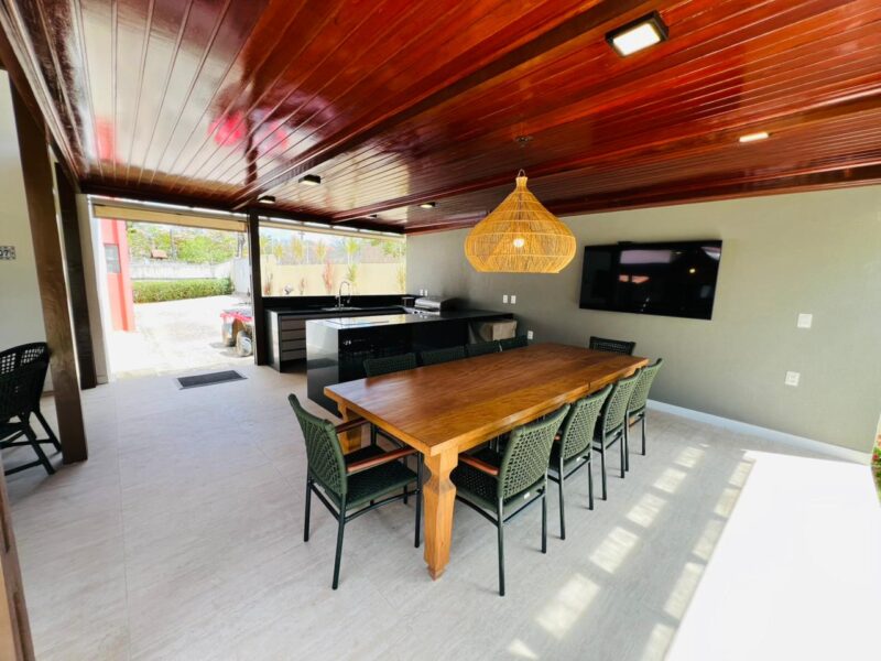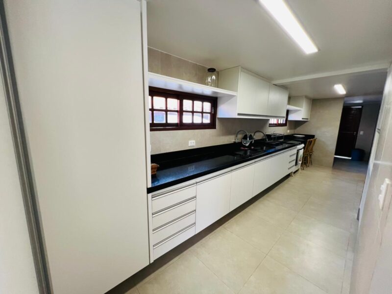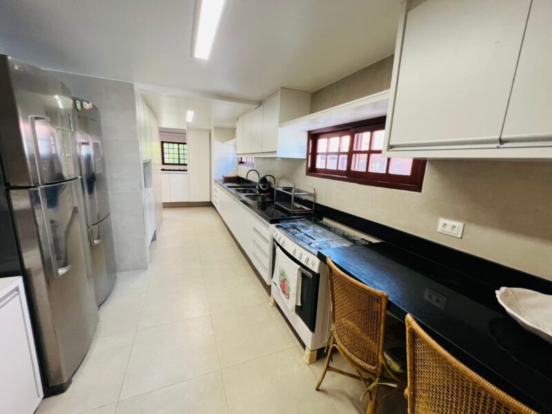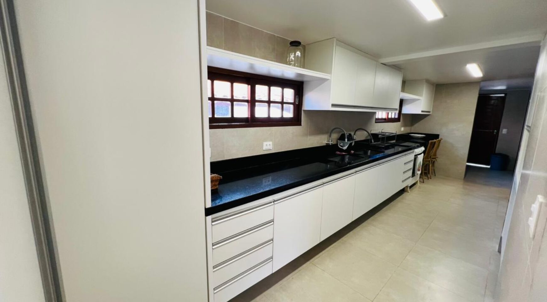 A cozinha é totalmente equipada, planejada para oferecer praticidade no dia a dia, e integrada aos demais ambientes de convivência. A casa possui também área de serviço mobiliada, funcional e bem distribuída.