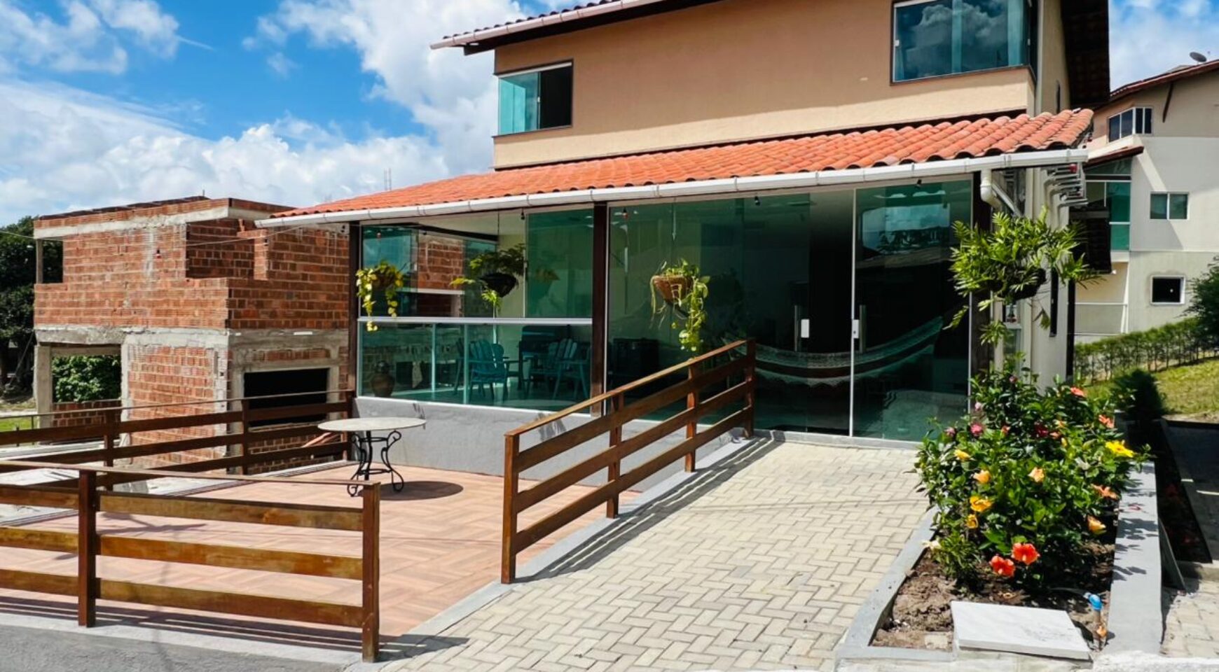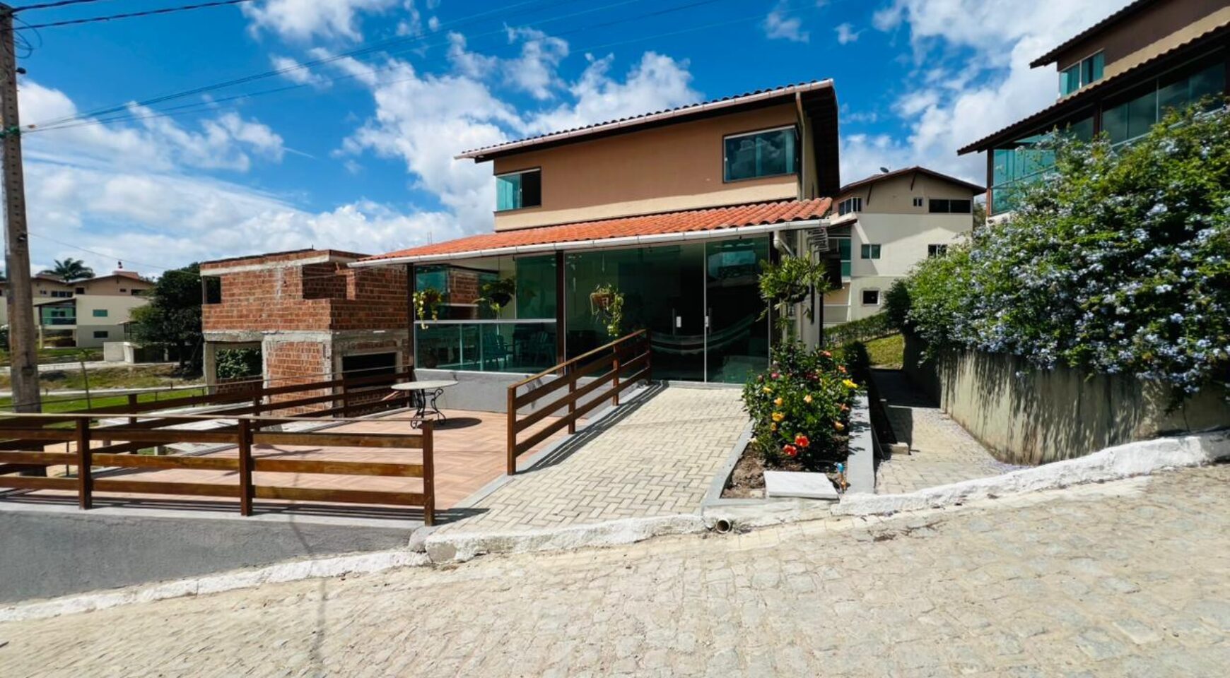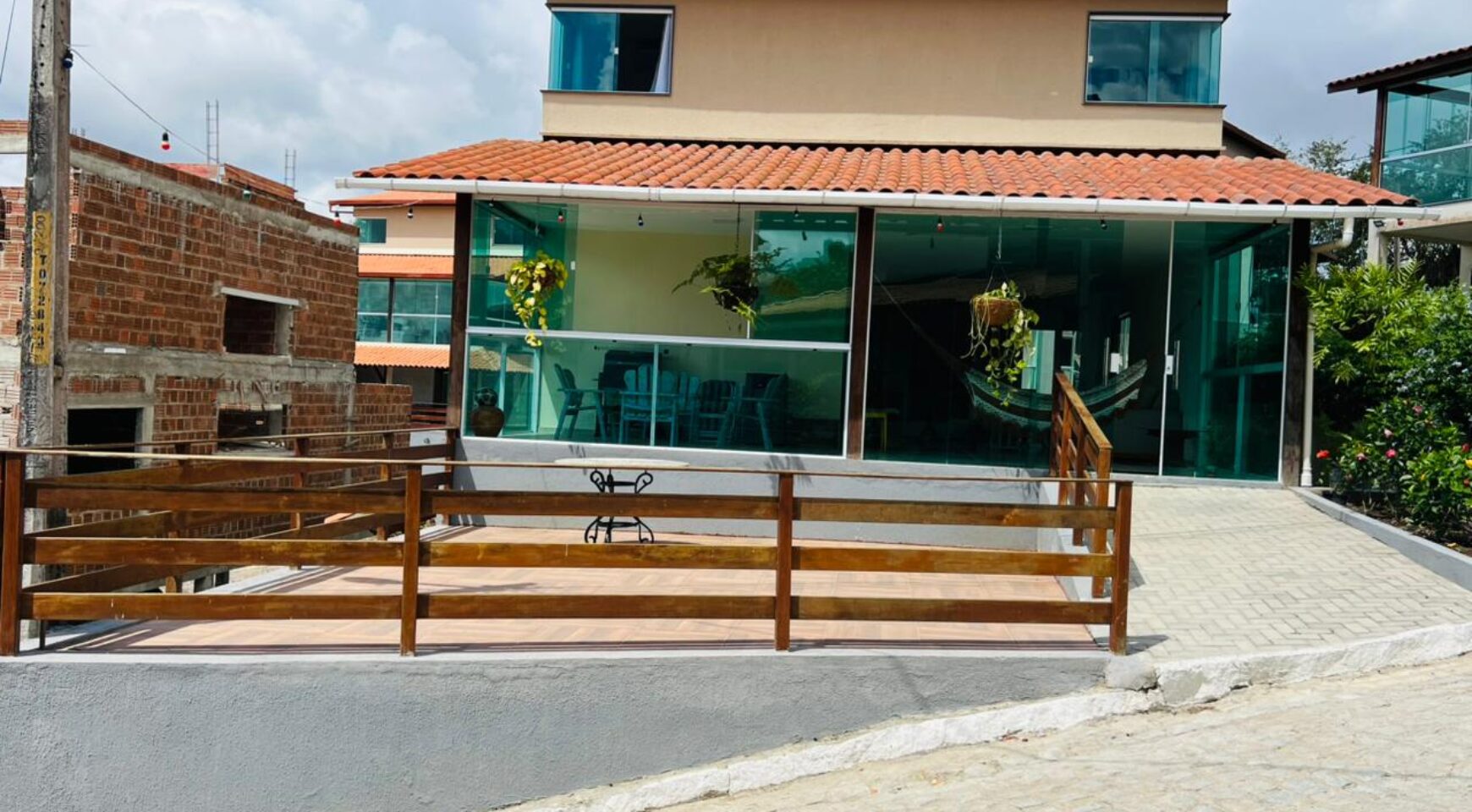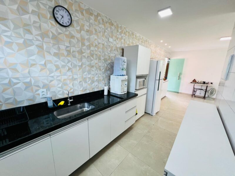 A casa principal com 256 metros possui um excelente projeto arquitetônico, com sala ampla para dois ambientes, oferecendo conforto e integração dos espaços. São 4 suítes, garantindo privacidade aos moradores, além de lavabo para maior comodidade. O imóvel dispõe ainda de um terraço agradável, perfeito para momentos de descanso, cozinha funcional, área de serviço bem planejada e ótima ventilação natural.