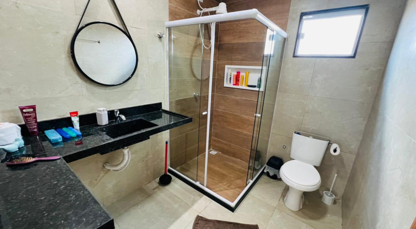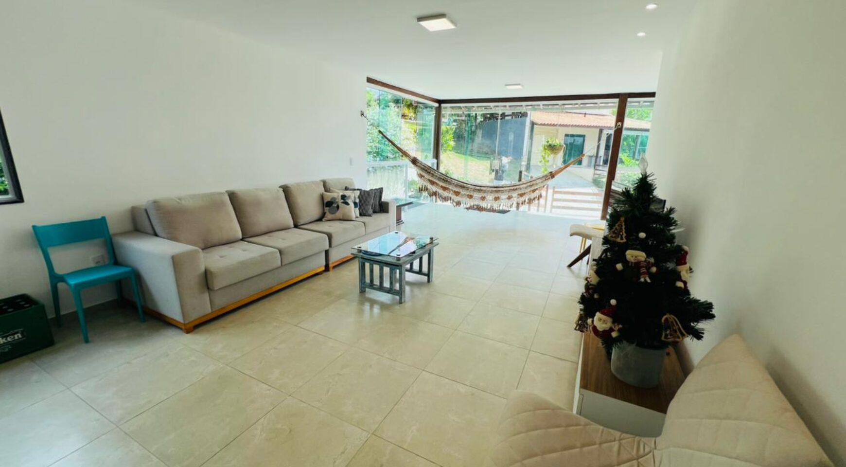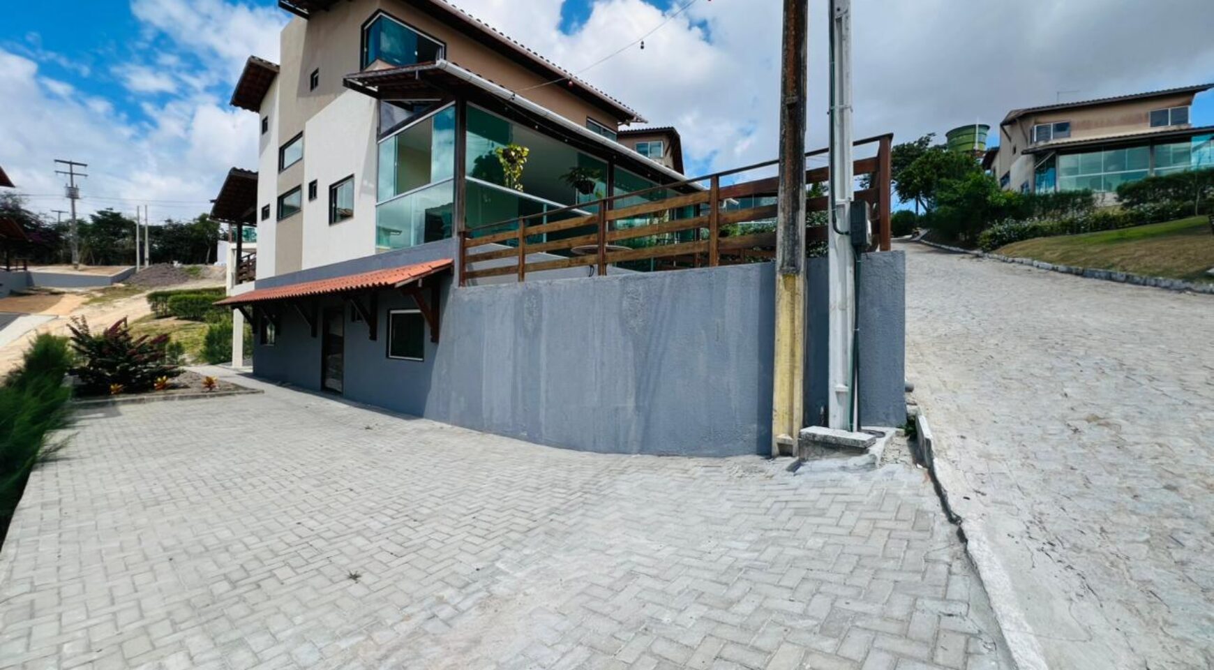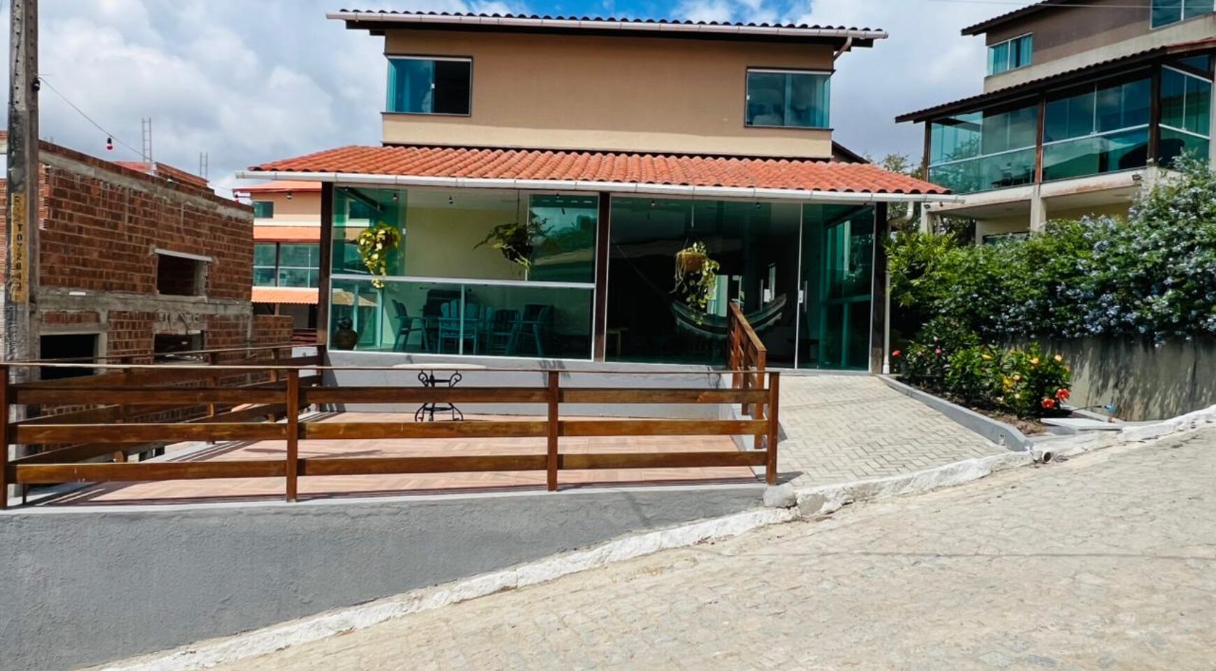 A casa principal com 256 metros possui um excelente projeto arquitetônico, com sala ampla para dois ambientes, oferecendo conforto e integração dos espaços. São 4 suítes, garantindo privacidade aos moradores, além de lavabo para maior comodidade. O imóvel dispõe ainda de um terraço agradável, perfeito para momentos de descanso, cozinha funcional, área de serviço bem planejada e ótima ventilação natural.