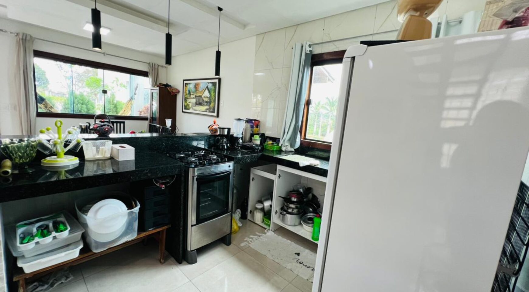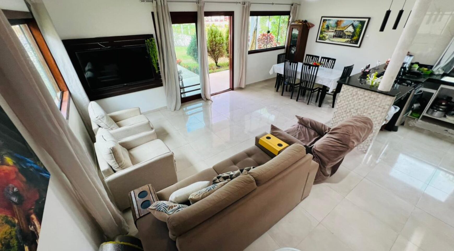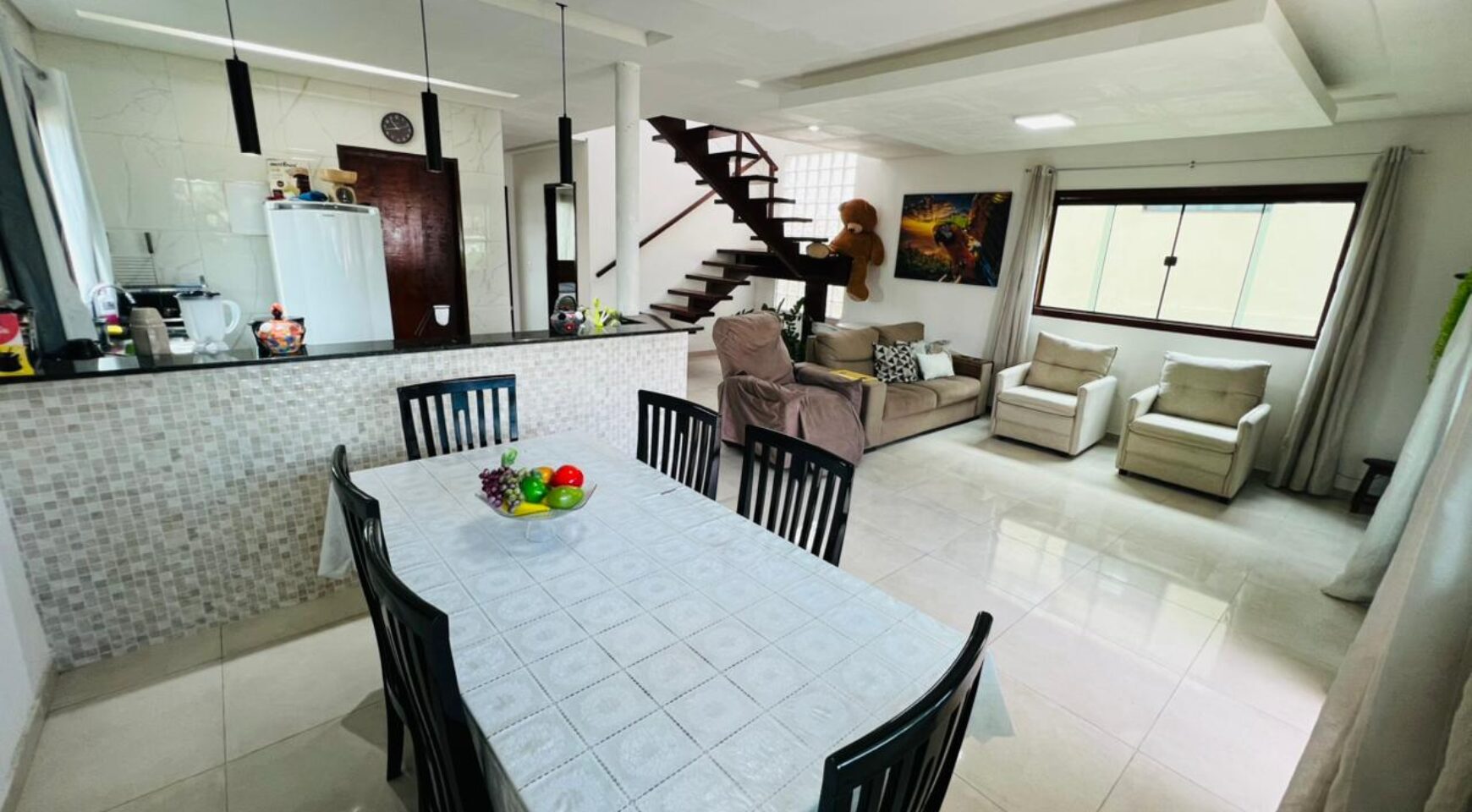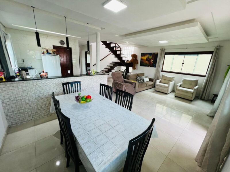 No pavimento térreo, a residência possui uma sala ampla para dois ambientes, com ótimo aproveitamento de espaço e iluminação natural. A cozinha integrada traz modernidade e funcionalidade, conectando-se harmoniosamente aos ambientes sociais. O pavimento conta ainda com área de serviço, 2 quartos bem distribuídos e 1 banheiro social, ideal para atender moradores e visitantes com conforto.
