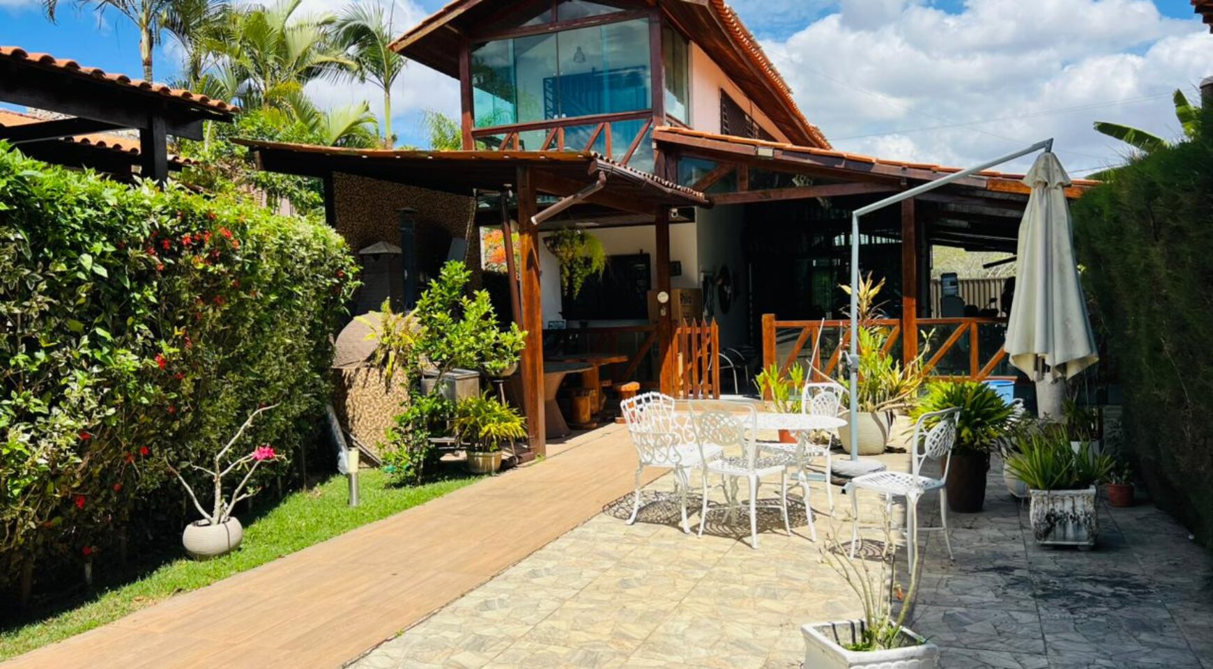 No pavimento térreo, o imóvel se destaca pelo jardim, que traz charme e contato com a natureza logo na entrada. A área gourmet é ideal para receber amigos e familiares, integrada a um terraço amplo, perfeito para momentos de lazer e confraternização. A sala para dois ambientes é espaçosa, bem iluminada e se conecta harmoniosamente à cozinha integrada, garantindo praticidade e funcionalidade. O andar ainda conta com WC social, 1 quarto, área de serviço e garagem para dois carros, proporcionando conforto e comodidade no dia a dia.