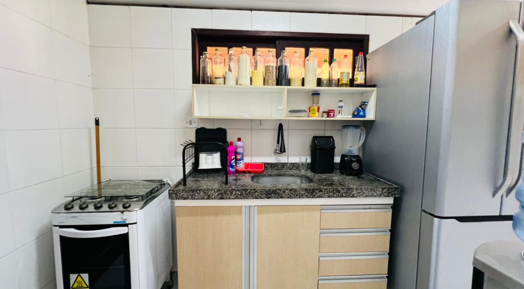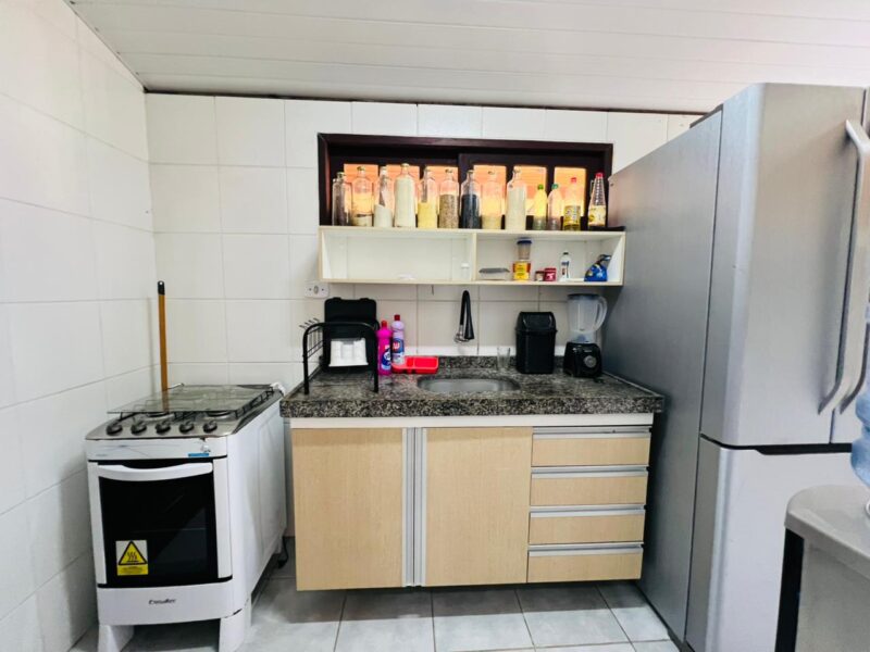 O térreo foi projetado para oferecer praticidade e integração dos ambientes. A cozinha é funcional e bem iluminada, conectando-se à sala ampla com dois ambientes — ideal para criar espaços distintos de estar e jantar. Grandes aberturas proporcionam excelente iluminação natural e ventilação, além de integrarem o interior ao exterior.